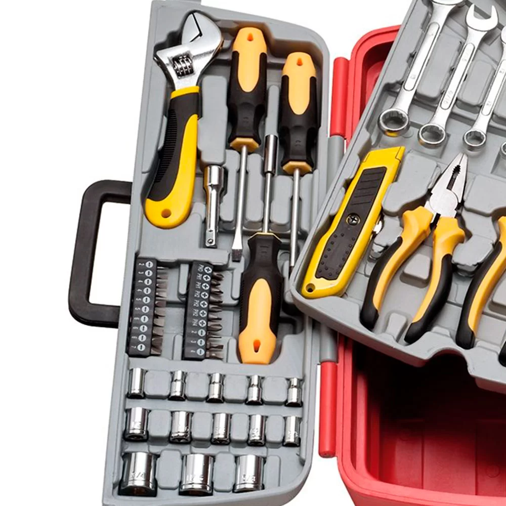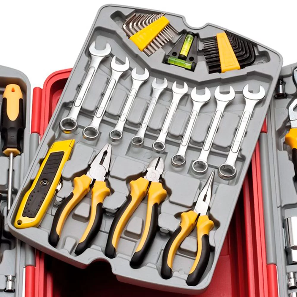 Jogo de ferramentas é composto por 113 peças fabricadas em material resistente, oferecendo alta durabilidade. As peças são acondicionadas em uma maleta dobrável, que oferece praticidade e facilidade para transportar e guardar todos os itens.